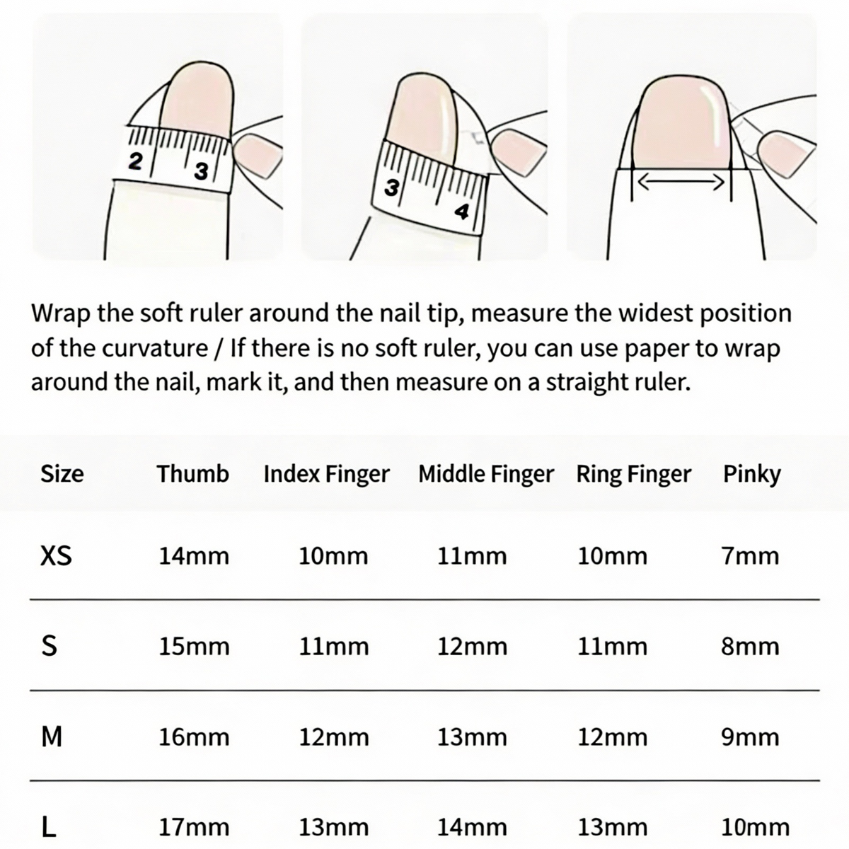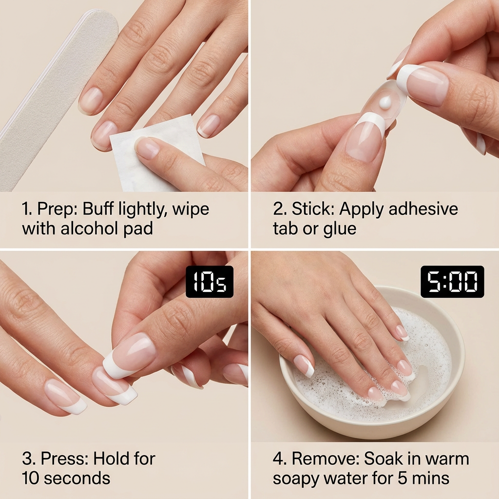 - 1 Application Kit (Mini buffer, cuticle stick, alcohol wipe, nail glue, and adhesive tabs).